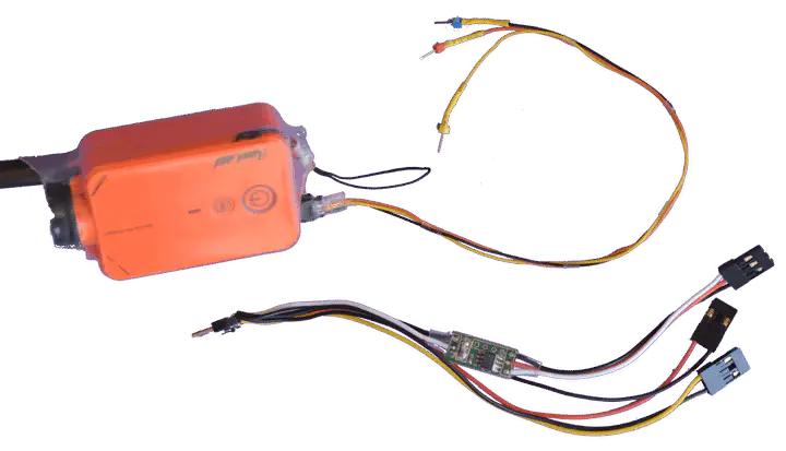 Top: RunCam 2 action cam with custom 3 wires cable powering the cam and triggering records. Bottom: Commercial cable with electronic converting RC PWM output to runCam2 control pulses pattern.Cable exist to connect a RunCam2 action cam to an RC receiver for remotely start and stop a record from the receiver PWM output (20ms period, 1ms to 2ms duty cycle). The cable has logic to decode the RC PWM signal and generate the signal pulse scheme to start and stop the RunCam2 record.